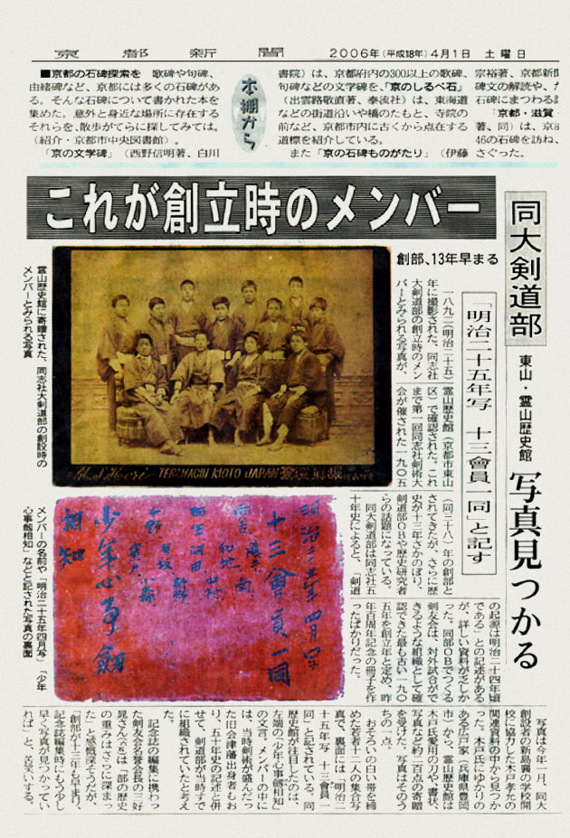 なお、この写真は京都堀眞澄写真館で撮影されたもので、木戸孝允と親交の深かった広戸家から霊山歴史館へ寄贈されたものです。霊山歴史館で鑑定した結果、剣道部創立時に撮った写真と認定されました。写真のメンバー12名の名前と出身地が下記のとおり判明していますので、関係のある方がいらっしゃったら霊山歴史館のご好意で写真のコピーが頂けますので、事務局または霊山歴史館木村学芸課長までごお申込下さい。